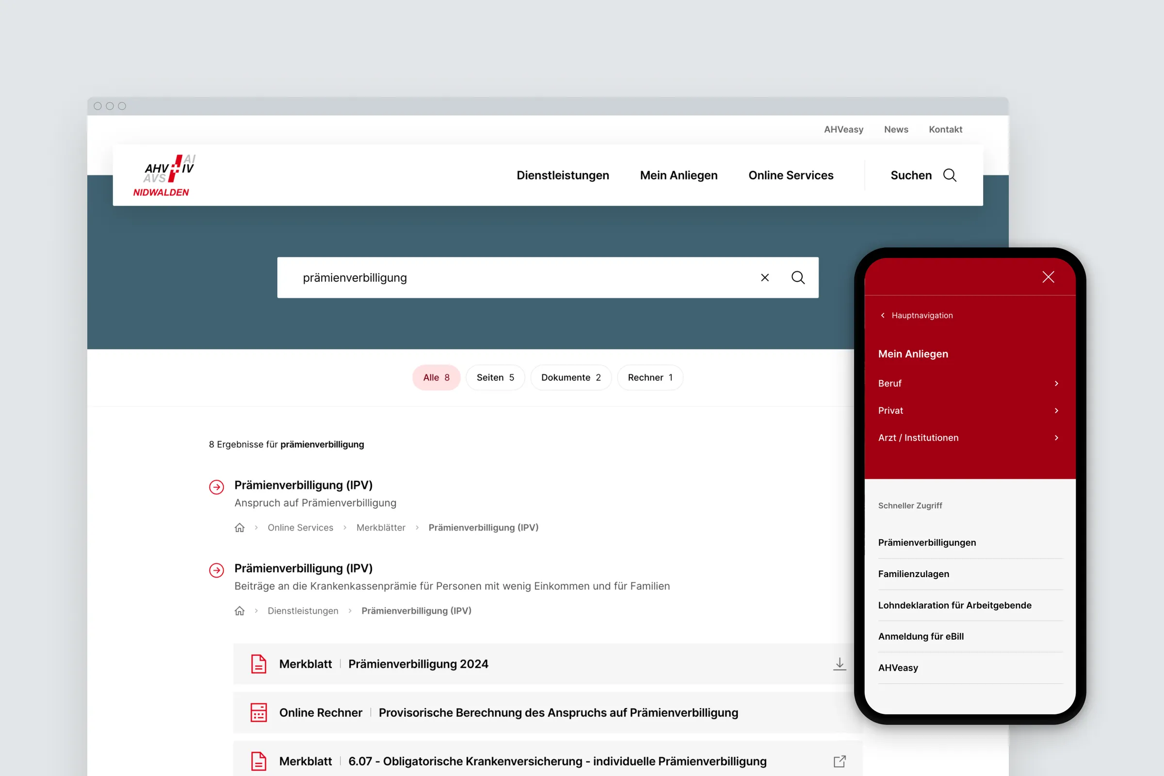 Mit der Entwicklung einer zentralen Masterwebseite für elf Ausgleichskassen und IV-Stellen hat Gold Interactive eine zukunftsfähige, moderne und benutzerfreundliche Lösung geschaffen. Die neue Webseite bietet eine klare Informationsarchitektur, eine intuitive Navigation und zielgruppen- orientierte Schnelleinstieg auf der Startseite für das effiziente Auffinden von Inhalten und Dienstleistungen. Die ausgeklügelte Suche mit Live Search, Suchbegriff-Synonymen, Filterfunktion, dem Related Content Feature und der visuellen Auszeichnung der verschiedenen Arten von Suchresultaten unterstützen die Nutzer:innen bei ihren Anliegen. Die gesamte Hosting-Lösung basiert auf CO2-neutralem Strom und trägt so aktiv zur Reduktion des ökologischen Fussabdrucks bei.
