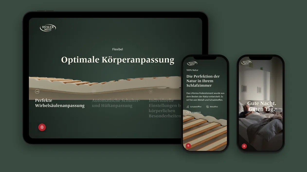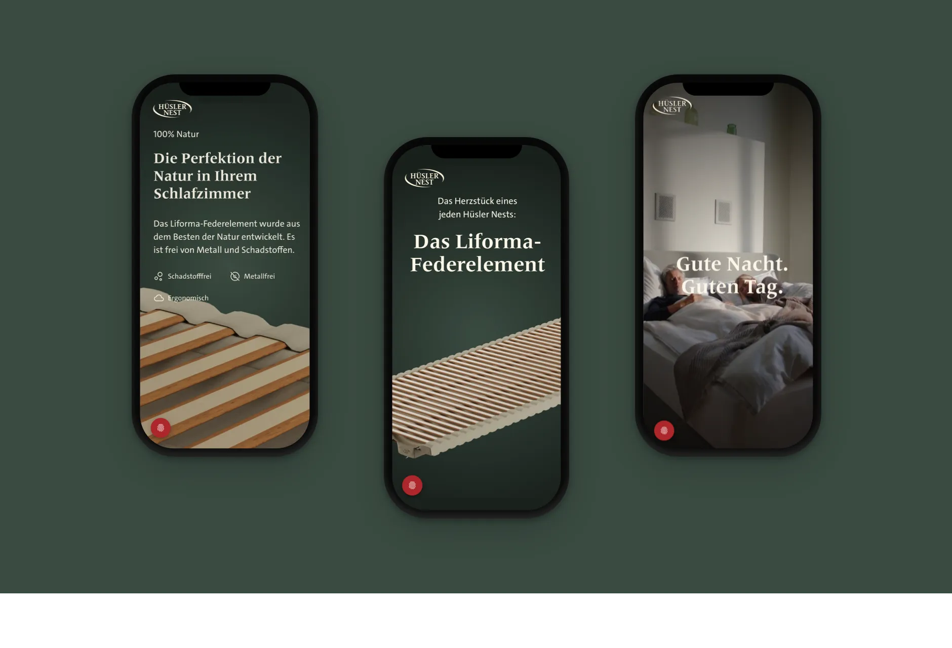 Unsere Aufgabe bestand darin, das Herzstück von Hüsler Nest zum Leben zu erwecken und fühlbar zu machen: Durch kreatives Scrollytelling erleben Website-Besucher auf intuitive Art und Weise, was ein Hüsler Nest ausmacht. Bahnbrechendes und flexibles Design, praktische Funktionsweisen und höchste Qualitätsstandards ermöglichen eine Schlafqualität, die ihresgleichen sucht. Alle Vorteile werden digital hervorgehoben und können von den interessierten Usern Schritt für Schritt entdeckt werden. Die simple und intuitive Funktionsweise einer Scrollytelling-Page bedeutet, dass Besucher:innen weder viel lesen noch klicken müssen – sie entdecken den Brand spielerisch und erleben durch einfaches Scrolling die spannende Geschichte des Hüsler Nests in seiner ganzen Vielfalt.