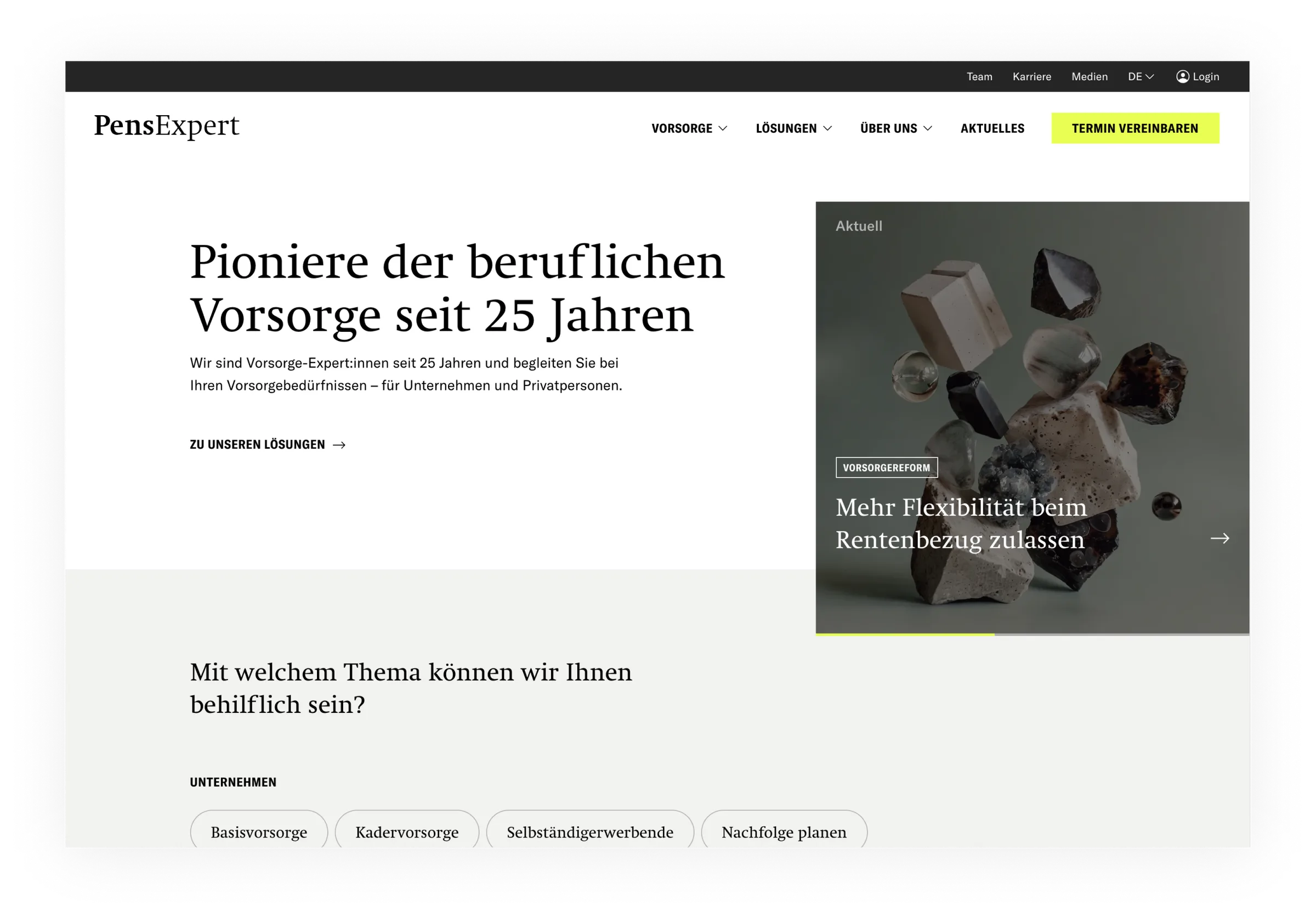 Im Rahmen einer umfassenden digitalen Neuausrichtung entstand für PensExpert eine moderne Markenpräsenz, die standfeste Vorsorgewerte mit zeitgemässer Nutzerführung verbindet.