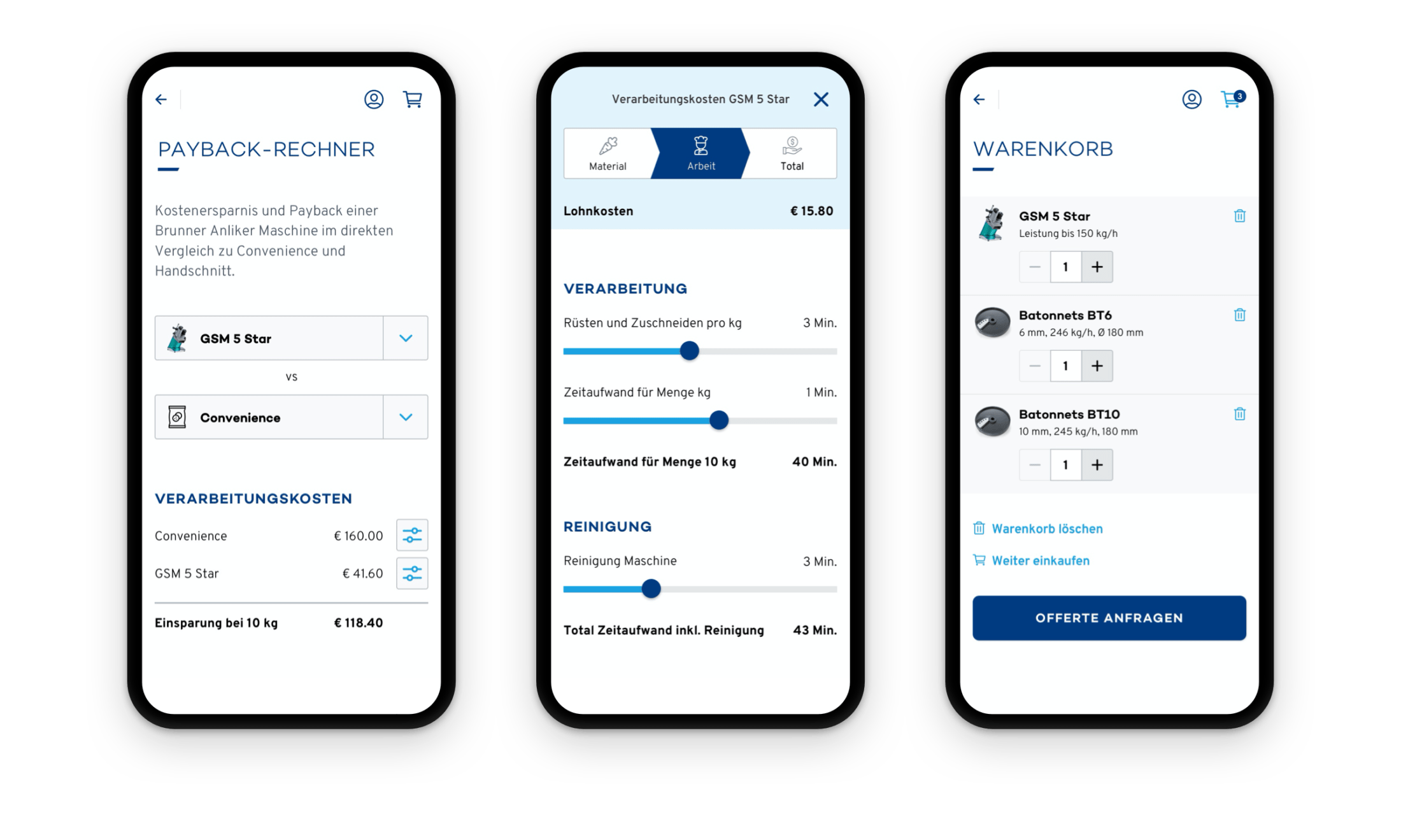 EasyTools liefert Zahlen, Fakten und Verkaufsargumente für die unterschiedlichen Maschinen-Typen. Mit dem Payback-Rechner lässt sich mit wenigen Klicks aufzeigen, wie schnell sich eine Maschine im Vergleich zur herkömmlichen Schneidemaschine oder zum Handschnitt amortisiert. Offertanfragen und Nachbestellungen lassen sich einfach erstellen. Anfragen werden direkt ins Backoffice gesendet und dort weiterbearbeitet.